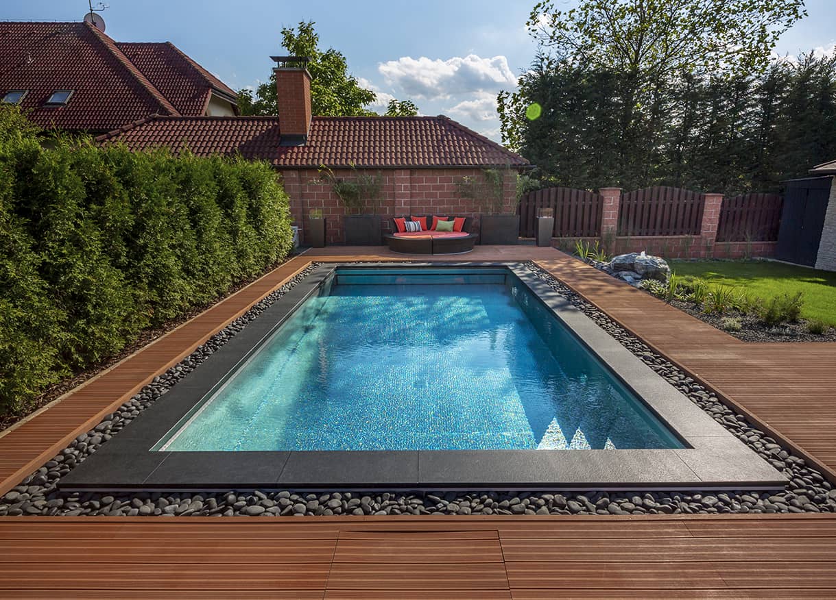 Typisierte Überlaufbecken erfordern lediglich eine Grundplatte, wobei sie nachfolgend nach der Verankerung mit Trockenbeton oder mit Kies umschüttet werden müssen. Alle typisierten Modelle sind wärmeisoliert und können mit einer beliebigen Beleuchtung, mehreren Treppentypen, einem automatischen Rollo und mit verschiedenen Attraktionen ausgestattet werden.