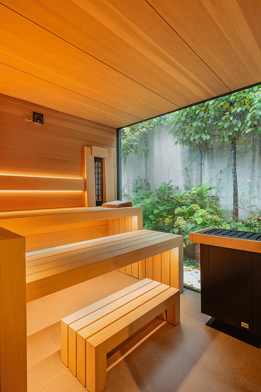 Součástí wellness je i krásná finská sauna má prosklený vstup a jednu exteriérovou stěnu, ze které je vidět na zeleň v zahradě. Nabízí tak dokonalý prostor pro relaxaci umocněný designovým LED světlem pod lavicemi a možnosti poslechu hudby. Lavice sauny jsou uspořádány do svou stupňů ve tvaru L a jsou vyrobené z africké vrby.