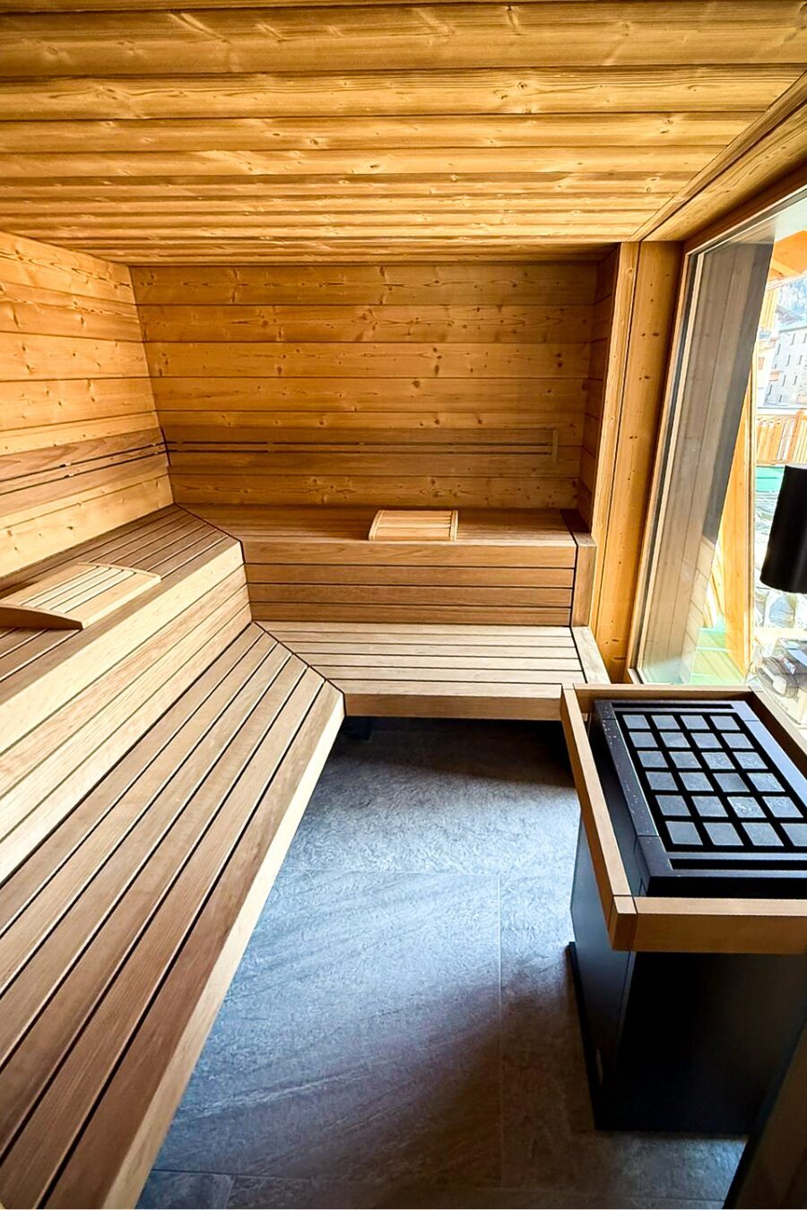 V prvním patře wellness zóny se nachází prostorná finská sauna TAO Trust o rozměrech 273 × 262 × 226 cm. Tento model je tvořen sendvičovou konstrukcí s přírodní tepelnou izolací, vnitřním obkladem z kartáčované termo borovice a dvoustupňovým uspořádáním lavic ve tvaru L. Lavice jsou z měkkého dřeva abachi, vybaveny opěrkami zad, dvěma podhlavníky a vstupní lavicí.