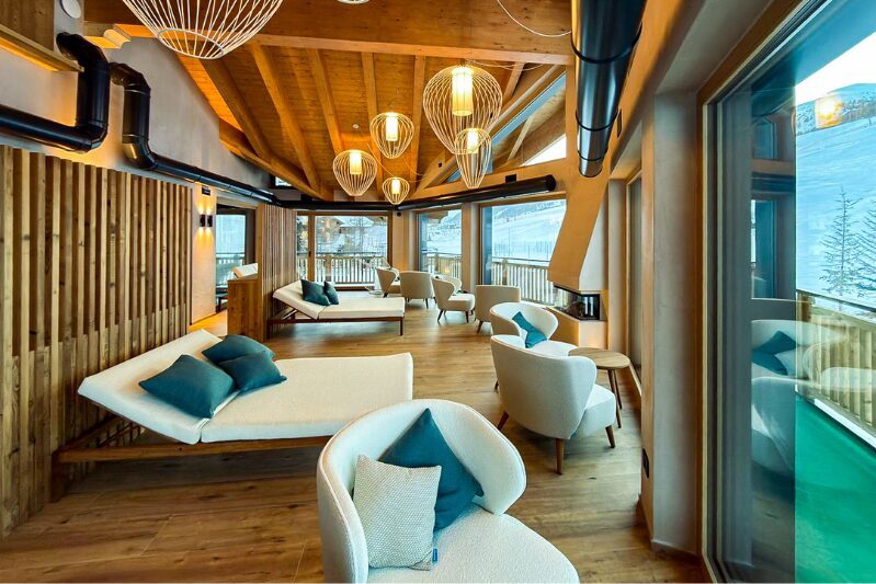Relaxační zážitek doplňují prostorné odpočinkové zóny v obou podlažích, umístěné v architektonickém výklenku s panoramatickými výhledy na hory a sjezdovky. Teplo a klid hotelového spa působí v kontrastu se zimní scenérií za okny a navozují pocit naprostého komfortu a útulnosti.