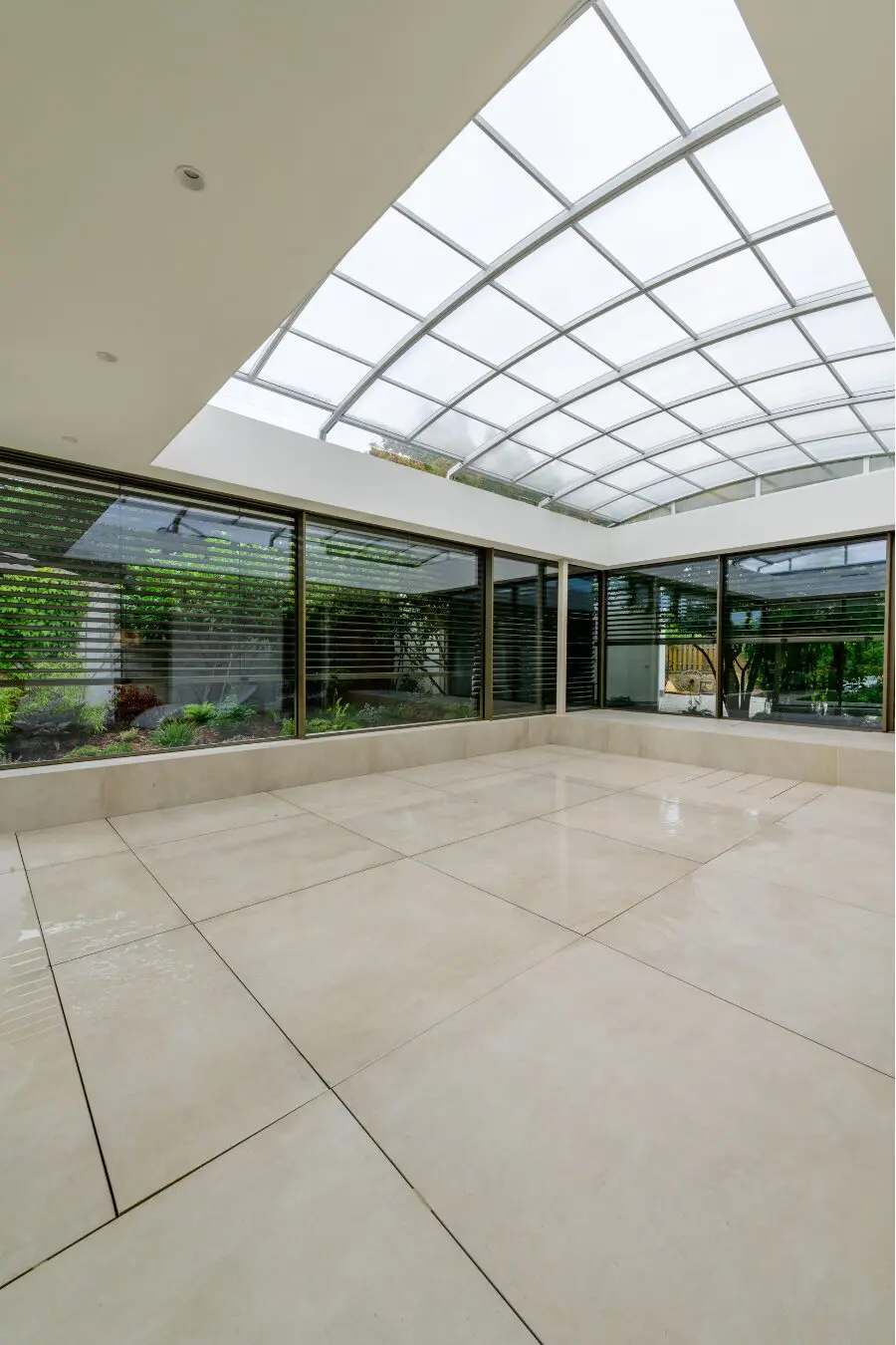 Srdcem tohoto projektu je hydraulicky ovládané zvedací dno, které umožňuje plynule nastavit hloubku od plavecké po bezpečné brouzdaliště. Povrch dna lze dokončit stejným materiálem jako okolní terasa – například kamenem nebo dlažbou – a při zakrytí tak bazén zcela zmizí z dohledu.