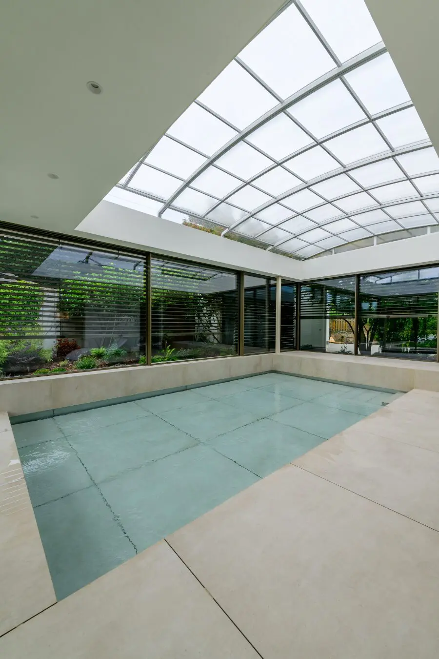 Základom tohto projektu je hydraulicky ovládané zdvíhacie dno, ktoré umožňuje plynulé nastavenie hĺbky od plávania až po bezpečné pádlovanie. Povrch dna môže byť upravený rovnakým materiálom ako okolitá terasa – napríklad kameňom alebo dlažbou – takže bazén po zakrytí úplne zmizne z dohľadu.